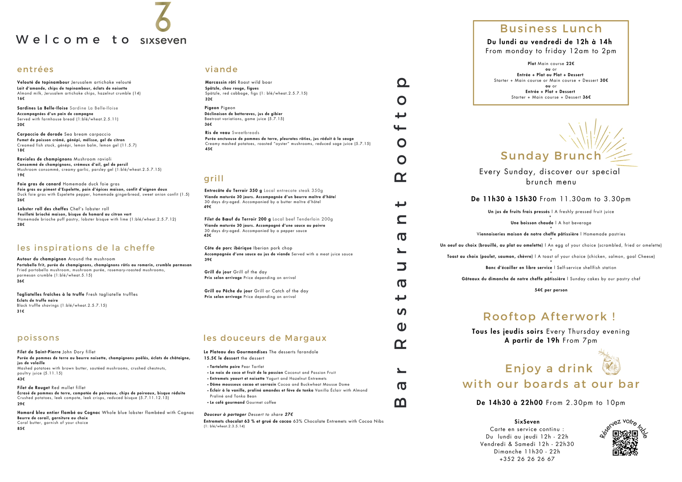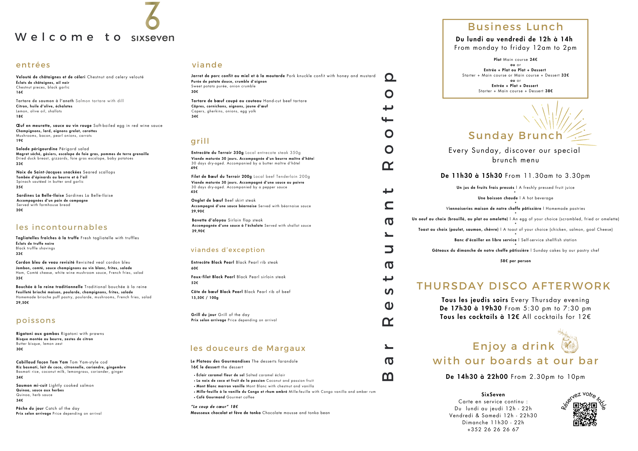 Brunch, Salon privé, privatisation du restaurant, Privatisation, Accès aux personnes à mobilité réduite, Terrasse panoramique, Privatisation du Rooftop, Piste de danse, Soirées dansantes, événéments, Séminaires, Animaux acceptés, Accès Wifi, Terrasse